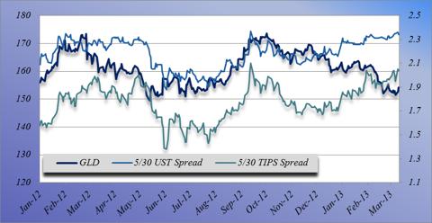 Since the beginning of QE IV and the debasement of the Japanese Yen (FXY) began the price of gold has been trading opposite of the inflation expectations of the market. In other words gold is not responding to inflation worries and this has confused and confounded many within the community, myself included. Note the inverse behavior between GLD and the 5/30 Treasury and 5/30 TIPS spread, when normally GLD trades in sympathy with these.