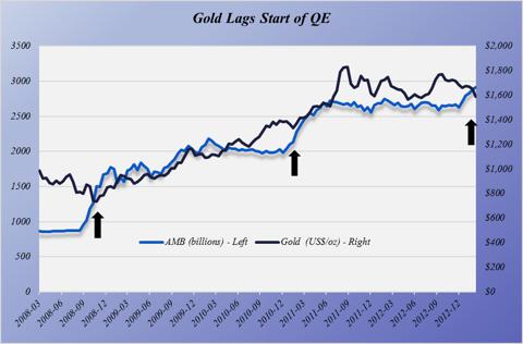 With every iteration of QE there is a time lag between its beginning and a rise in the price of gold. Ascribe what reasons you want to for it, but what is obvious by the headlines that the demand for physical gold as a form of savings is increasing. Savings in dollars is being punished with real interest rates being pushed down so saving in gold is the next recourse for people, institutions and governments. Once the disparity between the gold price and the reality of the money flow reaches a certain point gold is no longer available its current price. Then the scheduling problem takes over that Robert Blumen described so well and the price moves on the anticipation of there being lower future supply.